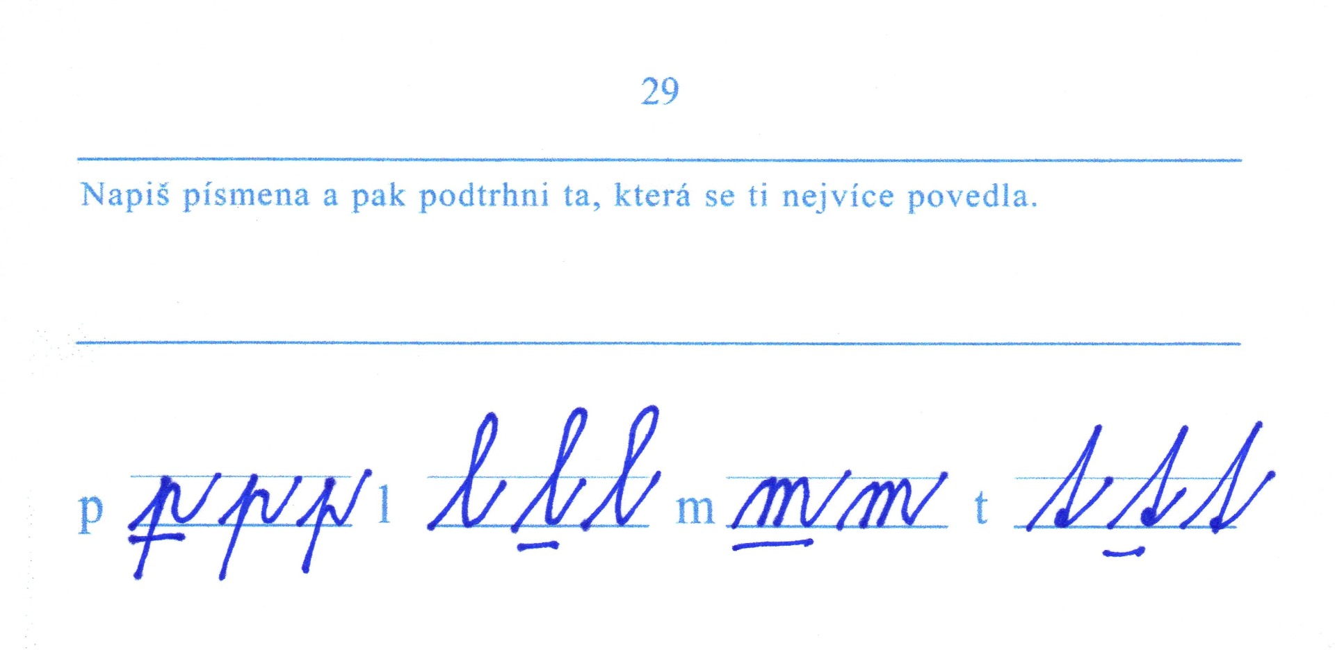 napište 3 tvary předtištěného písmena (jen u "m" a "ch" se vejdou pouze dvě písmena), pak zhodnoťte a ten nejpovedenější tvar podtrhněte - dle ukázky na obrázku
