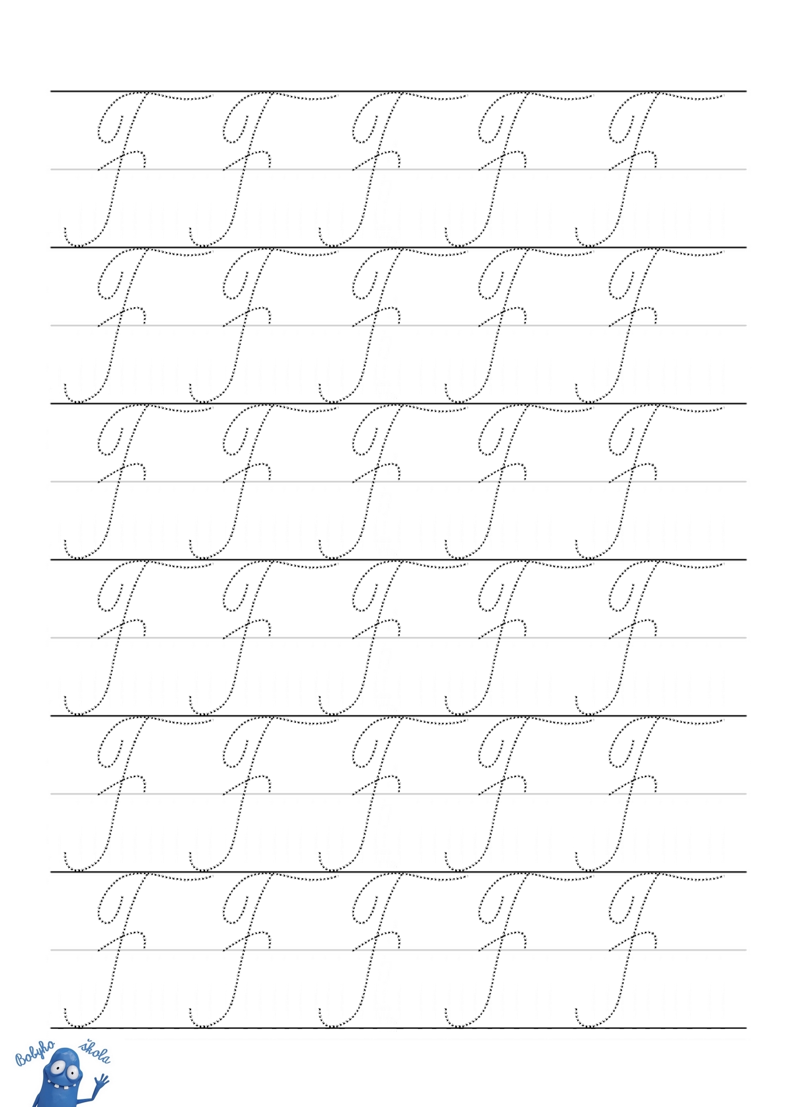 malé "f" je docela obtížné písmenko - pozor na směr otáčení spodní kličky - pod linkou musíme zatočit doprava - jinak než u písmen, která jsme zatím psali (j, J, y)